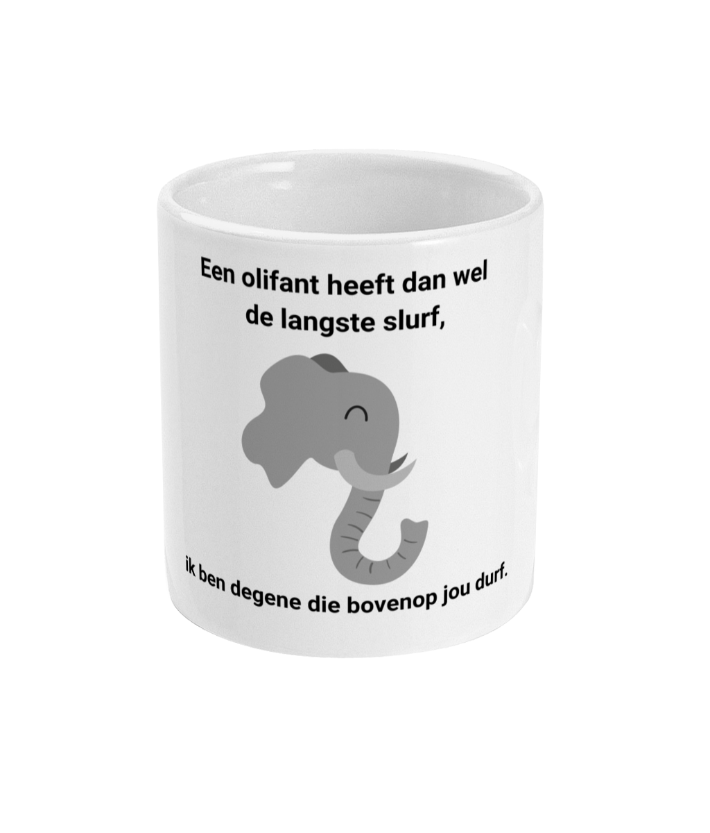 Een olifant heeft dan wel de langste slurf, ik ben degene die bovenop jou durf.