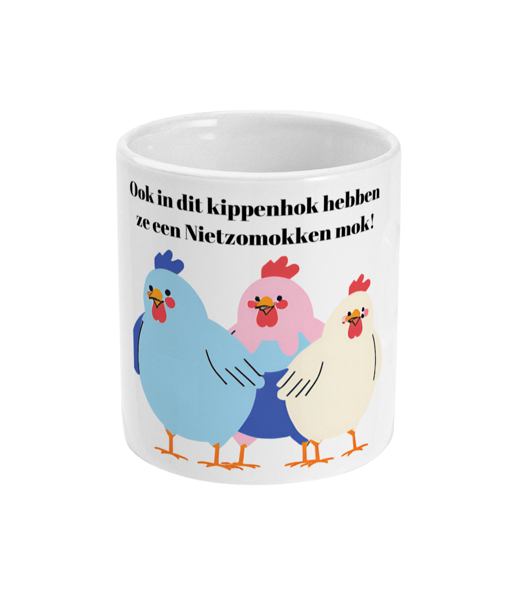 Ook in dit kippenhok hebben ze een Nietzomokken mok!